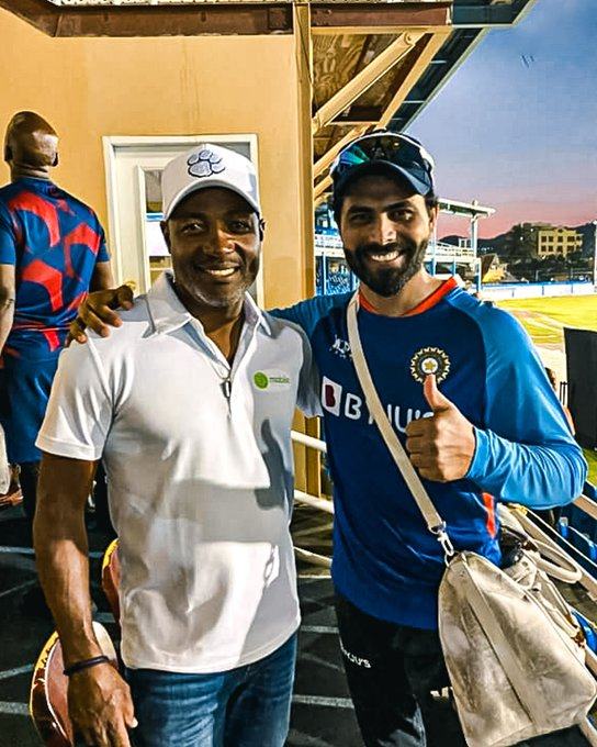 त्रिनिदाद। भारत के हरफनमौला खिलाड़ी रवींद्र जडेजा ने वेस्टइंडीज के खिलाफ तीन मैचों की सीरीज के दूसरे वनडे मैच के दौरान वेस्टइंडीज के पूर्व महान बल्लेबाज ब्रायन लारा से मुलाकात की। ऑलराउंडर ने पूर्व क्रिकेटर के साथ अपनी एक तस्वीर भी साझा की और लिखा- लीजेंड। ब्रायन लारा ने वेस्टइंडीज के लिए 430 अंतरराष्ट्रीय मैच खेले। इनमें 131 टेस्ट और 299 वनडे मैच शामिल हैं। टेस्ट में लारा के नाम 11,953 रन और वनडे में 10,405 रन हैं। टेस्ट की एक पारी म.......
