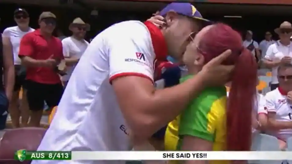 इंग्लैंड के लड़के ने ऑस्ट्रेलिया की लड़की को प्रपोज किया लड़की ने गले लगाकर रिंग पहनी ब्रिस्बेन। इंग्लैंड और ऑस्ट्रेलिया के बीच गाबा में खेले जा रहे पहले एशेज टेस्ट के दौरान एक रोचक घटना कैमरे में कैद हो गई। ऑस्ट्रेलिया की पहली पारी के दौरान मैदान के बाहर इंग्लैंड के एक युवा क्रिकेट फैन ने सभी का दिल जीत लिया। सोशल मीडिया पर शेयर किए गए एक वीडियो में लड़के ने मैच के दौरान ऑस्ट्रेलिया की अपनी प्रेमिका को प्रपोज किया, जिस पर लड़की ने ह.......