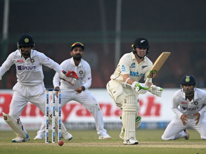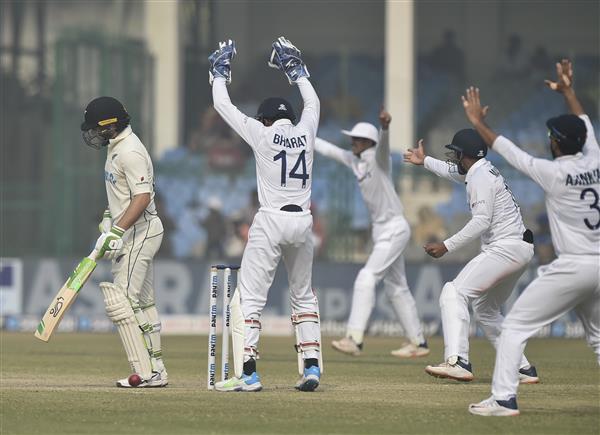 न्यूजीलैंड टीम 296 रन पर ढेर खेलपथ संवाद कानपुर। भारत और न्यूजीलैंड के बीच कानपुर में पहले टेस्ट के तीसरे दिन का खेल जारी है। जहां कीवी टीम अपनी पहली पारी में 296 रनों के स्कोर पर ऑलआउट हो गई। टॉम लाथम ने 95 और विल यंग ने 89 रनों की पारी खेली वहीं, भारत की ओर से अक्षर पटेल 5 विकेट लेने में सफल रहे। भारत के पास फिलहाल 49 रनों की बढ़त है। काइल जेमीसन 23 का विकेट आर अश्विन ने हासिल किया। इसके साथ ही अश्विन टेस्ट क्रिकेट में सबसे .......