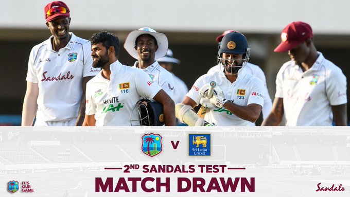 दूसरा टेस्ट मैच ड्रॉ नॉर्थ साउंड (एंटीगा)। लाहिरू थिरिमाने और कप्तान दिमुथ करुणारत्ने के बीच पहले विकेट के लिए शतकीय साझेदारी की मदद से श्रीलंका ने वेस्टइंडीज के खिलाफ दूसरा टेस्ट क्रिकेट मैच शुक्रवार को ड्रॉ कराया, जिससे दो मैचों की सीरीज बराबरी पर छूटी। श्रीलंका के सामने 377 रन का लक्ष्य था और आखिरी दिन उसे 348 रन चाहिए थे। करुणारत्ने (75) और थिरिमाने (39) ने पहले विकेट के लिए 101 रन जोड़े। इसके बाद ओशादा फर्नांडो (66) और दिनेश चांदीमल ने.......