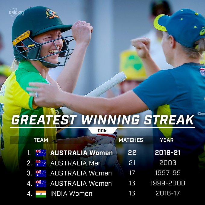 माउंट मानगानुई। आस्ट्रेलिया की महिला क्रिकेट टीम ने रविवार को न्यूजीलैंड को 6 विकेट से हराकर लगातार 22वां मैच जीता। इसी के साथ टीम ने रिकी पोंटिंग की अगुआई वाली अपने देश की पुरुष टीम के 2003 में बनाए लगातार सर्वाधिक एकदिवसीय अंतर्राष्ट्रीय जीत के रिकॉर्ड को तोड़ दिया। आस्ट्रेलिया की कप्तान मेग लेनिंग ने तीन मैचों की शृंखला के पहले मैच में टॉस जीतकर पहले गेंदबाजी करने का फैसला किया और फिर मैच की सर्वश्रेष्ठ खिलाड़ी मेगान शुट के 4 विकेट.......