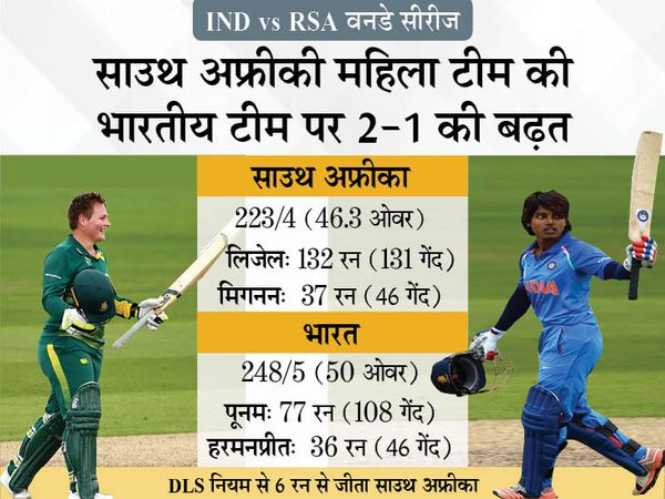 डकवर्थ लुईस मेथड से 6 रन से जीता साउथ अफ्रीका लिजेल 131 गेंदों पर 132 रन बनाकर नॉटआउट रहीं लखनऊ। साउथ अफ्रीकी महिला टीम ने लखनऊ के इकाना स्टेडियम में खेले गए तीसरे वनडे में डकवर्थ लुईस मेथड से भारत को 6 रन से हरा दिया। इस जीत से साउथ अफ्रीकी टीम 5 मैच की सीरीज में 2-1 से आगे हो गई है। बारिश से बाधित इस मैच में साउथ अफ्रीका ने टॉस जीतकर पहले गेंदबाजी का फैसला किया। भारत ने पहले बल्लेबाजी करते हुए 5 विकेट पर 248 रन बनाए। जवाब में साउथ .......