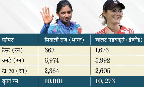 इंटरनेशनल क्रिकेट में सबसे ज्यादा रन बनाने वाली चार्लेट से सिर्फ 272 रन पीछे लखनऊ। भारतीय महिला वनडे टीम की कप्तान मिताली राज ने साउथ अफ्रीका के खिलाफ तीसरे वनडे में एक और कीर्तिमान अपने नाम किया। वे इंटरनेशनल क्रिकेट में 10 हजार रन पूरे करने वाली दुनिया की दूसरी और भारत की पहली महिला क्रिकेटर बन गई हैं। मिताली ने शुक्रवार को साउथ अफ्रीका के खिलाफ 35 रन पूरी करते ही यह रिकॉर्ड बनाया। मिताली ने अब तक करियर में 46.73 की औसत से 10,001 र.......