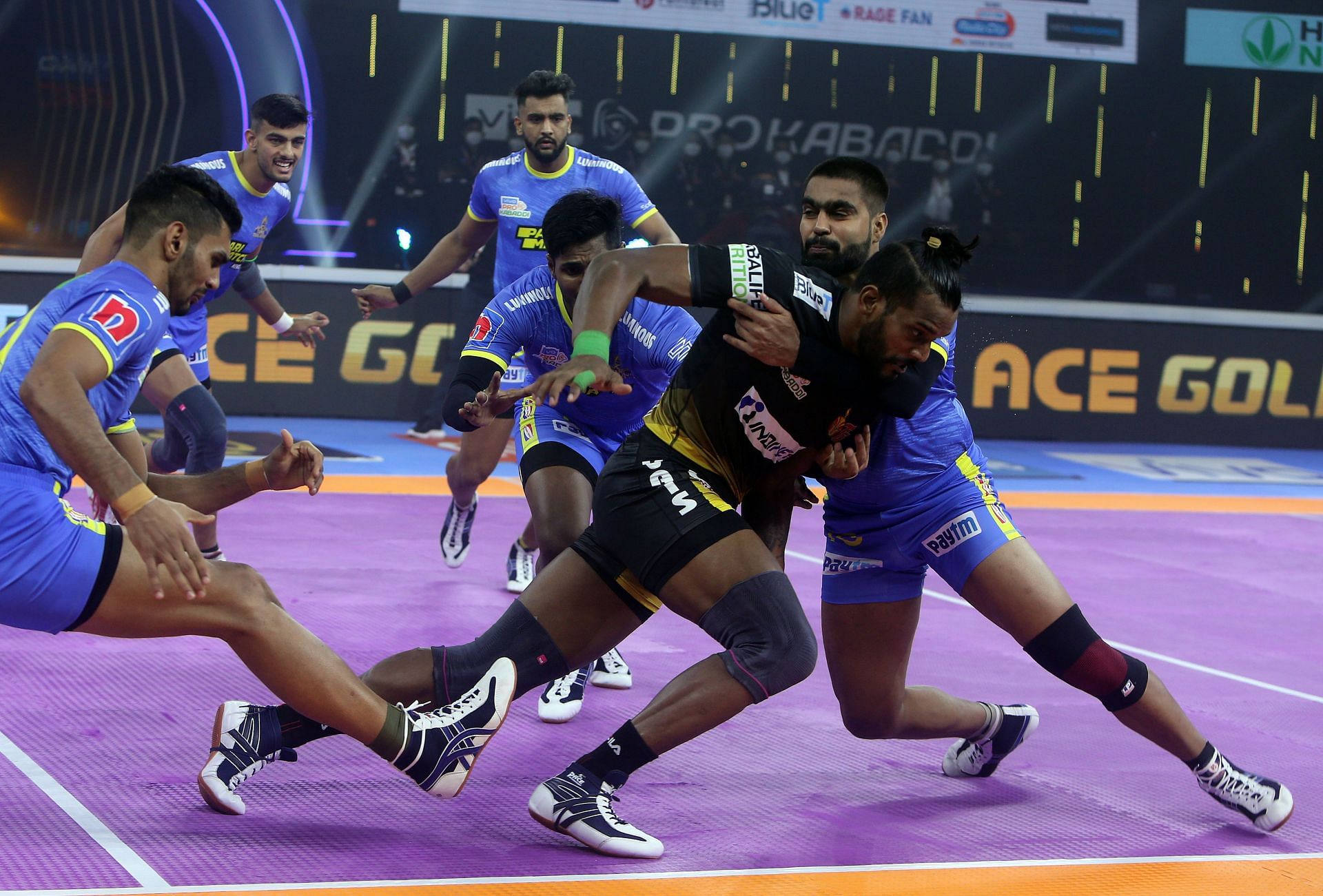 तेलुगू-तमिल का मुकाबला ड्रॉ पर खत्म खेलपथ संवाद बेंगलूरु। देश की चर्चित प्रो कबड्डी लीग के 8वें सीजन का आगाज बुधवार को हो गया। सीजन के पहले मैच में यू मुंबा ने बेंगलुरु बुल्स को 46-30 से हराकर जोरदार शुरुआत की। इसके बाद दिन के दूसरे मुकाबले में दक्षिण भारत की दो टीमें तमिल थलाइवाज और तेलुगू टाइटन्स ने एक-दूसरे के साथ ड्रॉ खेला, जबकि दिन के अंतिम मुकाबले में गत चैम्पियन बंगाल वॉरियर्स ने यूपी योद्धा को 38-33 से हराकर खिताब बचाने की अप.......