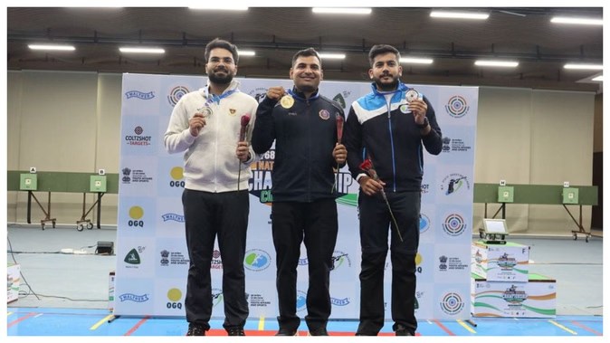 68वीं राष्ट्रीय निशानेबाजी चैम्पियनशिप में ओलम्पियन को पछाड़ा खेलपथ संवाद भोपाल। नौसेना के किरण अंकुश जाधव ने सोमवार को 68वीं राष्ट्रीय निशानेबाजी चैम्पियनशिप में पुरुषों की 10 मीटर एयर राइफल स्पर्धा में ओलम्पियन अर्जुन बबूता की पछाड़कर स्वर्ण पदक जीता। जाधव ने 252.1 अंक के साथ पहला स्थान हासिल किया जबकि बबूता ने 251.4 अंक के साथ रजत पदक.......
