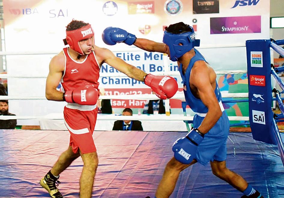 राष्ट्रीय मुक्केबाजी चैम्पियनशिप खेलपथ संवाद हिसार। विश्व चैम्पियनशिप के कांस्य पदक विजेता असम के शिवा थापा और 2018 राष्ट्रमंडल खेलों के रजत पदक विजेता सेना के मनीष कौशिक ने राष्ट्रीय मुक्केबाजी चैम्पियनशिप में 63.5 भार वर्ग के सेमीफाइनल में प्रवेश कर लिया है। वहीं 2018 राष्ट्रमंडल खेलों के स्वर्ण पदक विजेता गौरव सोलंकी (60) को रेलवे के वरिंदर सिंह ने पराजित कर अंतिम चार में जगह बना ली। सेना के मोहम्मद हुसामुद्दीन .......