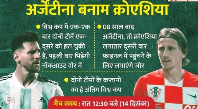 पहला सेमीफाइनल अर्जेंटीना और क्रोएशिया के बीच होगा दोहा। अपना पांचवां और अंतिम विश्व कप खेल रहे अर्जेंटीना के दिग्गज लियोनल मेसी मंगलवार को लुसैल स्टेडियम में लुका मॉड्रिच की अगुआई वाले क्रोएशिया के मजबूत डिफेंस को तोड़कर फीफा विश्व कप के ड्रीम फाइनल में जगह बनाना चाहेंगे। दूसरी ओर 37 वर्षीय मॉड्रिच का यह चौथा और आखिरी विश्व कप है। वह अपनी कप्तानी में देश को पहला विश्व खिताब दिलाने के लिए ब्राजील के नेमार की तरह मेसी के सपने को तोड़ना चाहें.......