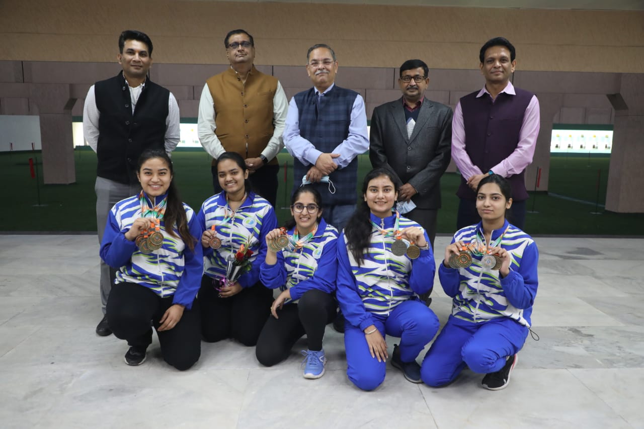 64वीं राष्ट्रीय रायफल शूटिंग चैम्पियनशिप-2021 खेलपथ संवाद भोपाल। मध्यप्रदेश शूटिंग अकादमी के खिलाड़ियोें ने शानदार प्रदर्शन करते हुए 64वीं राष्ट्रीय रायफल शूटिंग चैम्पियनशिप-2021 में सोमवार को 50 मीटर थ्री पोजीशन में 3 स्वर्ण, 4 रजत और 3 कांस्य पदकों सहित कुल 10 पदक अपने नाम कर लिए। उल्लेखनीय है कि मध्यप्रदेश के खिलाड़ियों ने अब तक इस चैम्पियनशिप में कुल 32 पदक अपने नाम कर लिए हैं। मेडल सेरेमनी में प्रदेश के पूर्व पुलिस मह.......