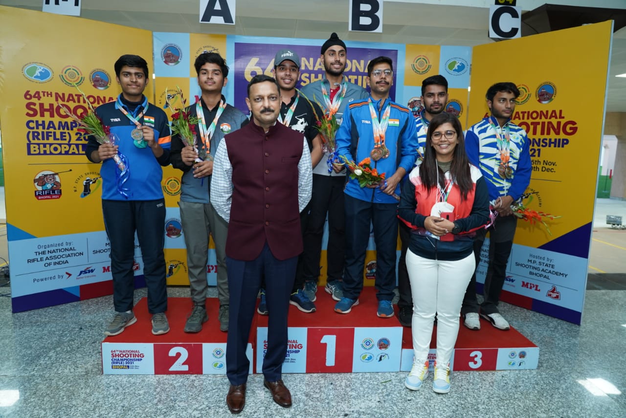 64वीं राष्ट्रीय रायफल शूटिंग चैम्पियनशिप भोपाल। मध्यप्रदेश शूटिंग अकादमी के शूटरों का 64वीं राष्ट्रीय रायफल शूटिंग चैम्पियनशिप में शानदार प्रदर्शन जारी है। अकादमी के स्टार ओलम्पियन ऐश्वर्य एवं अविनाश ने स्वर्ण पदक पर निशाने लगाए। ऐश्वर्य एवं अविनाश ने तीन-तीन स्वर्ण पदक व्यक्तिगत और टीम स्पर्धा में अभी तक जीते हैं। ऐश्वर्य प्रताप सिंह ने सीनियर मेन्स इवेन्ट में कांस्य पदक अर्जित किया वहीं जूनियर व्यक्तिगत और टीम स्पर्धा में तीन स्वर्ण पदक अ.......
