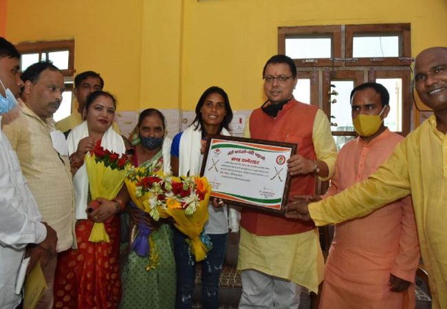 हॉकी बेटी को दिया 25 लाख रुपये का चेक खेलपथ संवाद हरिद्वार। मुख्यमंत्री पुष्कर सिंह धामी गुरुवार को सीधे नई दिल्ली से लौटने के बाद हरिद्वार जिले दौरे पर रहे। गुरुवार को वह भारतीय हॉकी खिलाड़ी वंदना कटारिया के घर गए और उन्हें बधाई दी। मुख्यमंत्री ने भारतीय महिला हॉकी टीम की खिलाड़ी वंदना कटारिया से मुलाकात कर उन्हें स्मृति चिह्न भेंट किया। मुख्यमंत्री ने शॉल ओढ़ाकर वंदना को सम्मानित किया। मुख्यमंत्री पुष्कर सिंह धामी ने कहा कि .......