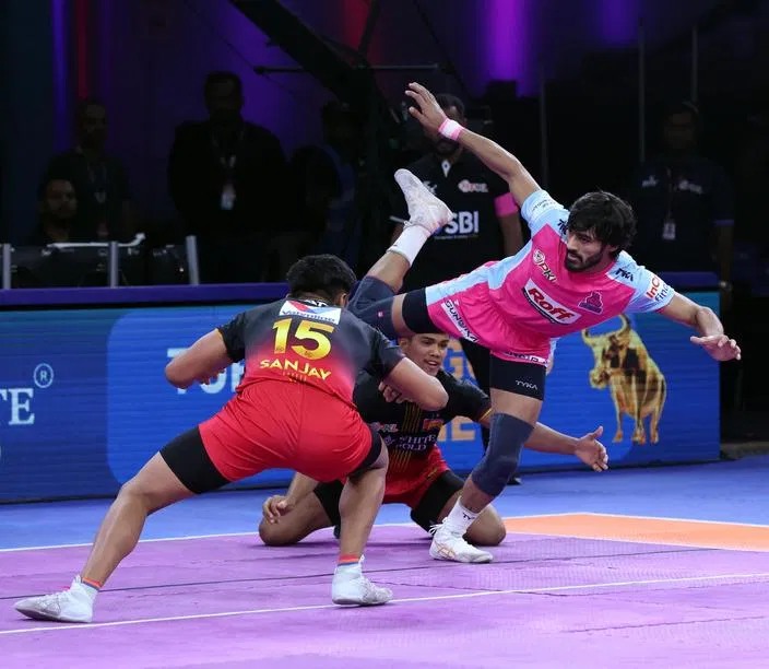 जयपुर पिंक पैंथर्स को घरेलू मैदान पर 27-22 से हराया खेलपथ संवाद जयपुर। प्रो कबड्डी लीग सीजन-12 के 29वें मैच में शुक्रवार को जयपुर के सवाई मानसिंह इंडोर स्टेडियम में खेले गए मुकाबले में बेंगलुरु बुल्स ने अपने जबरदस्त डिफेंस और संतुलित खेल की बदौलत जयपुर पिंक पैंथर्स को 27-22 से मात दी। इस जीत के साथ बुल्स ने लगातार तीसरी जीत दर्ज की और अं.......