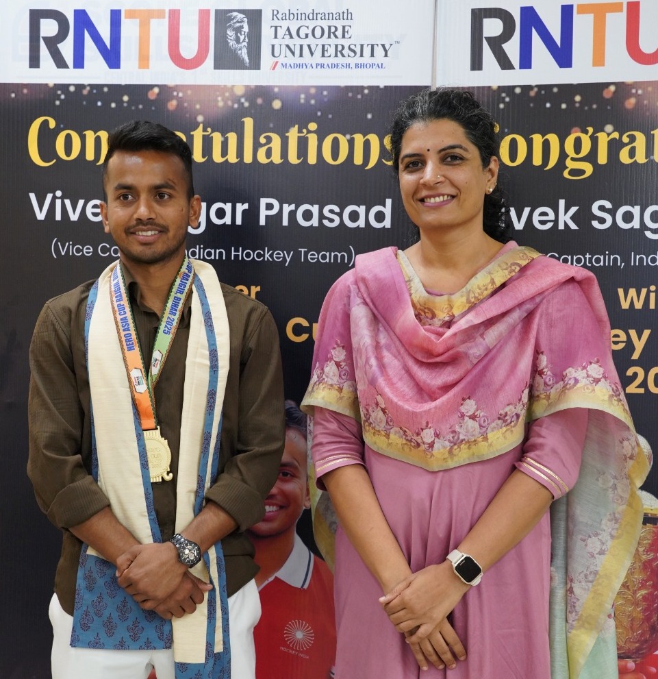 अनुशासन, निरंतर मेहनत और सकारात्मक सोच से ही सफलता सम्भव खेलपथ संवाद भोपाल। रबीन्द्रनाथ टैगोर विश्वविद्यालय (आरएनटीयू) ने भारतीय हॉकी स्टार विवेक सागर प्रसाद को एशिया कप 2025 में शानदार प्रदर्शन करने तथा भारत को खिताबी जीत दिलाने में अहम भूमिका के लिए एजीयू स्पोर्ट्स अचीवर्स अवॉर्ड से सम्मानित किया गया। स्कोप ग्लोबल स्कि.......