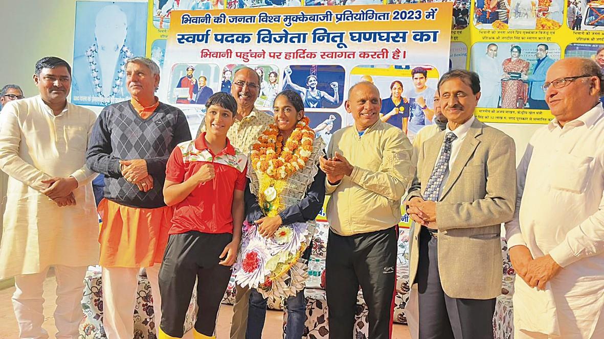 भिवानी के खिलाड़ियों ने दुनियाभर में चमकाया प्रदेश का नाम: धर्मबीर सिंह खेलपथ संवाद भिवानी। अपने दमदार मुक्कों से देश को विश्व बॉक्सिंग चैम्पियनशिप में गोल्ड मेडल दिलाने वाली गोल्डन गर्ल नीतू घणघस का भिवानी पहुंचने पर शानदार विजय जुलूस निकाल कर स्वागत किया गया। हर किसी ने अपनी लाड़ली को सिर आंखों पर बैठाया और जगह-जगह नीतू को नोटों की मालाओं से लाद दिया। भिवानी को बॉक्सरों की बदौलत मिनी क्यूबा कहा जाता है, अब इनमें एक नाम बॉक्सर नीतू .......