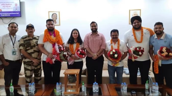 स्वागत में जुटे परिजनों ने ढोल की थाप पर किया भांगड़ा खेलपथ संवाद अमृतसर (पंजाब)। बर्मिंघम में हो रहे कॉमनवेल्थ खेलों में पदक जीत देश का नाम रोशन करने वाले पंजाब के चार खिलाड़ी शनिवार को भारत लौट आए। बर्मिंघम से श्री गुरु रामदास जी अंतरराष्ट्रीय एयरपोर्ट पर पहुंचे सभी खिलाड़ियों का अमृतसर के डिप्टी कमिश्नर हरप्रीत सिंह ने स्वागत किया और उन्हें बुके देकर बेहतर भविष्य की कामना की। अमृतसर जिला के गांव बल सचंदर के वेटलिफ्टर .......