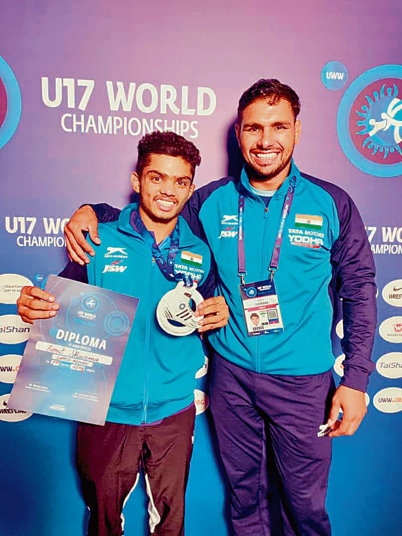 अंडर-17 वर्ल्ड चैम्पियनशिप में पहलवान रोहित ने जीता सिल्वर मेडल खेलपथ संवाद सोनीपत। नीरज चोपड़ा के भाला फेंक में रजत पदक जीतने के बाद मंगलवार रात सोनीपत के युवा पहलवान रोहित शर्मा ने दुनिया में फिर देश का नाम रोशन किया। रोहित ने इटली के रोम में चल रही अंडर-17 वर्ल्ड चैम्पियनशिप में 48 किलोग्राम भार वर्ग में सिल्वर मेडल पर दांव लगाया। रोहतक के गांव घिलौड़ के रहने वाले रोहित सोनीपत जिले के गांव जुआं के अखाड़े में अभ्यास करते हैं। .......