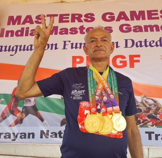 76 की उम्र में बेंगलुरु में जीते छह मेडल अब तक 131 गोल्ड, 18 सिल्वर व 4 ब्रांज मेडल जीतकर नया इतिहास बना चुके खेलपथ संवाद चरखी-दादरी। बाढड़ा निवासी रामकिशन शर्मा ने एक बार फिर अपनी खेल प्रतिभा का जलवा दिखाया है। उन्होंने 27 से 30 मार्च तक कर्नाटक के बेंगलुरू में आयोजित 42वीं नेशनल वेटरन एथलेटिक्स चैम्पियनशिप में 4 स्वर्ण व 2 रजत पदक समेत 6 मेडल हासिल जीतकर हरियाणा का गौरव बढ़ाया। रामकिशन शर्मा ने 70 वर्ष से अधिक आयुवर्ग .......